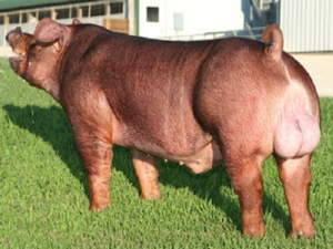 Nguồn giống: Lợn Duroc hay còn được gọi là heo bò là giống lợn có nguồn gốc từ Mỹ. Đặc điểm: đây là giống lợn cao sản cho năng suất thịt cao và đặc biệt là cho thịt lợn siêu nạc. Lợn Duroc có thân hình vững chắc, lông có màu nâu vàng nhạt đến nâu sẫm. Bốn chân lợn to khỏe, vững chắc, ngực sâu, rộng, mông vai phát triển và cân đối, mõm thẳng, tai to ngắn, ở phần tai trước cụp, gập về phía trước, chất lượng thịt tốt (thịt mềm do mô nạc xen lẫn với mô mỡ dắt), tỉ lệ nạc cao (56-58%), thịt nạc màu đỏ đậm, khả năng tăng trọng nhanh, tiêu tốn thức ăn/1 kg tăng trọng thấp, đẻ con ít, tiết sữa kém.