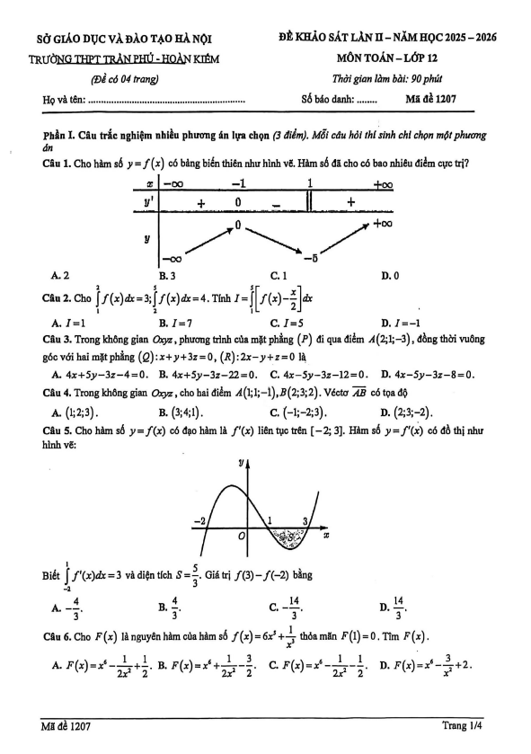 Đề khảo sát Toán 12 lần 2 năm 2025 – 2026 trường THPT Trần Phú – Hà Nội 27/02/2026