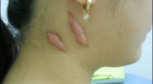 7. Sẹo lồi (Keloids, cheloides) Là u nguồn gốc chân bì tăng sinh Collagen tự nhiên xuất hiện hoặc sau chấn thương đặc biệt sau vết mổ ngoại khoa và sau bỏng. Thường gặp ở người da đen nhiều hơn và người có cơ địa sẹo lồi, nguyên nhân chính xác không rõ, có khi thành ác tính nhưng hiếm. Đốt điện vùng ức cổ và một số vùng khác có thể kèm theo mô sẹo tăng sinh bất thường rất khó phân biệt với sẹo lồi cả về lâm sàng và hiển vi. Ban đầu tổn thương màu đỏ hồng, trơn bóng, căng với bề mặt giãn mạch, nó phát triển to lên đến một kích cỡ nào đó rồi không thay đổi. Dần dần theo tuổi nó trở nên cứng chắc, ít đỏ, thậm trí tái nhợt hơn da bao quanh. Sẹo lồi đôi khi có thể phân biệt với sẹo phì đại bằng khuynh hướng phát triển ra ngoài biên giơí của vết mổ bệnh nhân có thể kêu đau, ngứa. Hình ảnh hiển vi: sớm: mô tế bào xơ, muộn: bó sợi collagen.