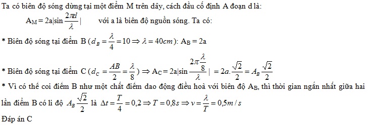 Nhận biếtMột sợi dây đàn hồi căng ngang, đang có sóng dừng ổn định. Trên dây, A là một điểm nút, B là một điểm bụng gần A nhất, C là trung điểm của AB, với AB = 10 cm. Biết khoảng thời gian ngắn nhất giữa hai lần mà li độ dao động của phần tử tại B bằng biên độ dao động của phần tử tại C là 0,2 s. Tốc độ truyền sóng trên dây là