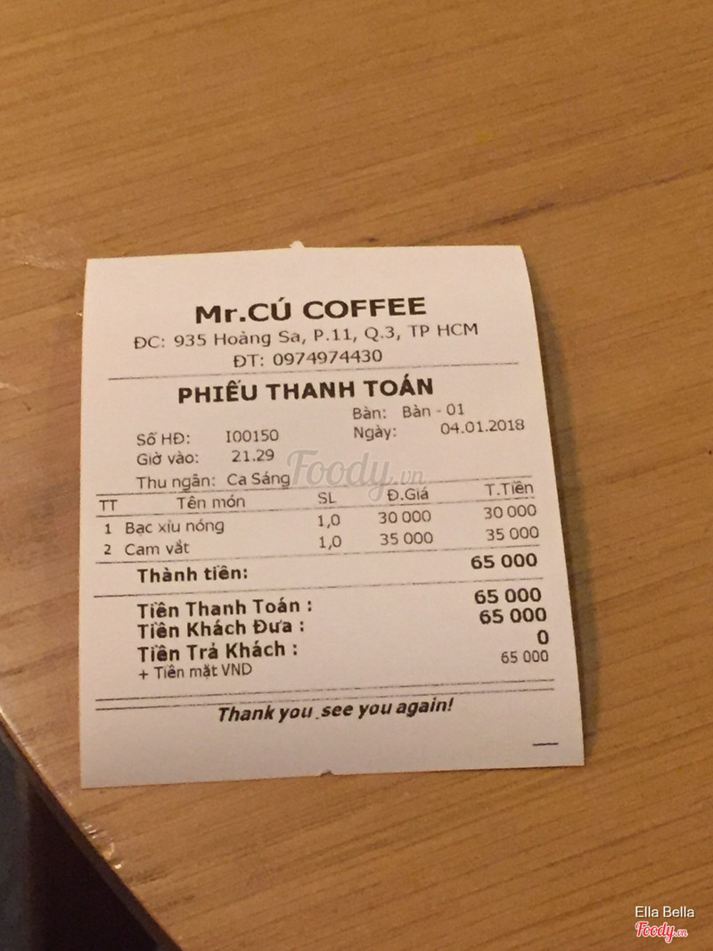 Ella Bella đã bình luận bằng iPhone 06/01/2018 08:33:30, 7.6 Mr. CÚ Coffee Đi cũng 2 hôm rồi, quán này mở tới 5 rưỡi sáng lận luôn nhé. Mình và bạn gọi bạc xỉu và cam vắt. Bạc xỉu ngọt nên bạn nào ko thích quá thì nói nhân viên giảm bớt đường lại nhé. Không gian quán khá ổn, tuy nhiên hơi nhỏ chứa tầm 30 người là full. Đồ uống giá cả rẻ nhé. Có truyện và đach cho mình đọc nữa ha :) ...Xem thêm