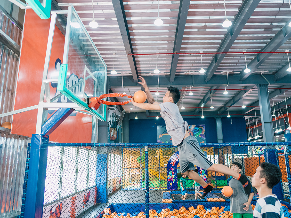 Khu vực bóng rổ được bố trí với các chiều cao thích hợp nằm trên đường chạy là bạt nhún. Đến với trò chơi này, bạn sẽ có cơ hội trở thành siêu sao đập bóng cực kỳ đỉnh.