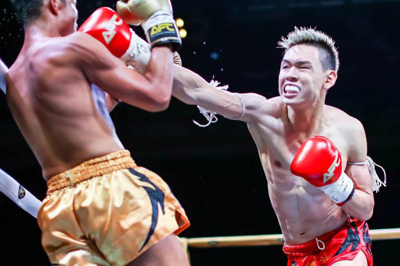 Wynn Neo (right), seen here competing in the Asia Fighting Championship in 2017, will compete for the WBC Muay Thai featherweight title at Singapore Fighting Championship on June 29, 2019.