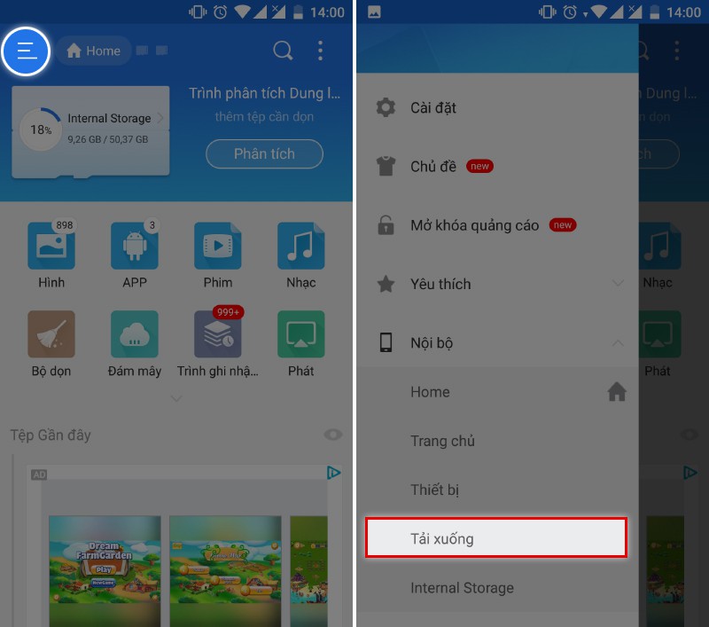 Bước 3: Khởi động ứng dụng ES File Explorer File Manager vừa tải về > Sau đó chọn More (biểu tượng 3 gạch ngang) > Tải xuống.