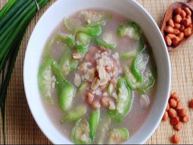 Bước 3: Cho lạc đã giã vào nồi, thêm nước. Khi nước sôi, thêm gia vị cho vừa ăn, đun khoảng 5 phút thì thêm mướp vào. Mướp chín tới tắt bếp, rắc hành lá vào và thưởng thức.