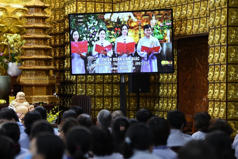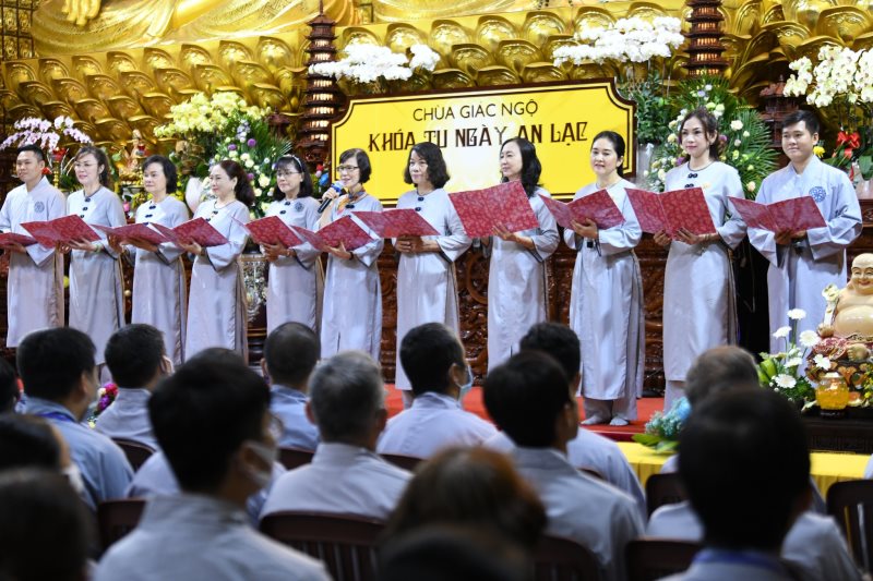 Dưới sự hướng dẫn của Tăng đoàn Chùa Giác Ngộ, các hành giả đã được học tập và chiêm nghiệm những lời dạy quý báu của đức Phật khi tụng Kinh Chuyển Pháp Luân, Kinh Thực Tập Vô Ngã và Kinh Tám Điều Giác Ngộ Của Bậc Đại Nhân do TT. Thích Nhật Từ, Trụ trì Chùa Giác Ngộ soạn dịch. Khi thực hành thiền tọa, ĐĐ. Thích Lệ Tuân cũng chia sẻ những kinh nghiệm vừa thực tế, vừa khoa học để giúp đại chúng trải nghiệm sự an lạc, thảnh thơi trong giờ phút hiện tại, khi thân và tâm quy về chung một mối.