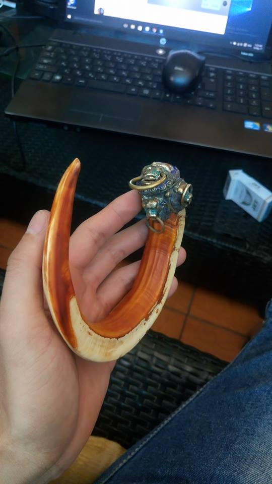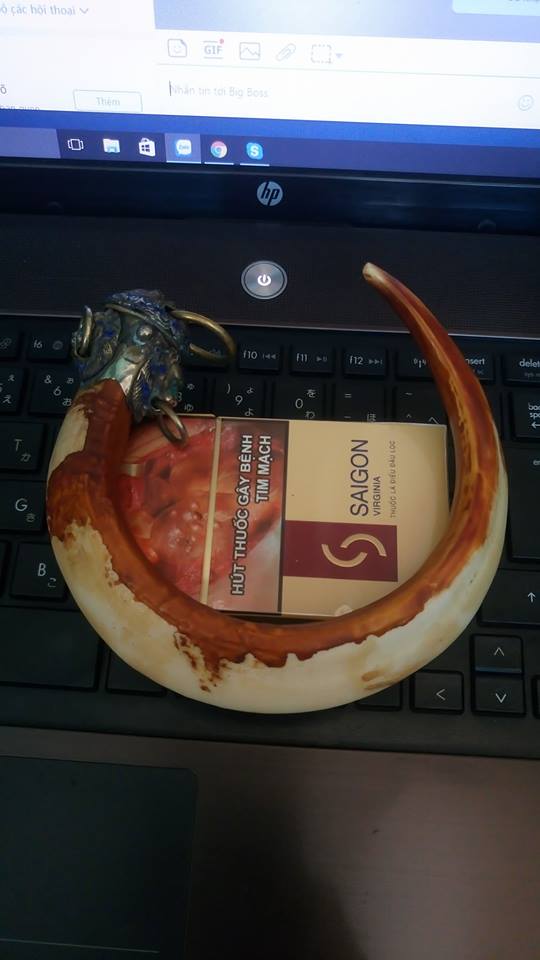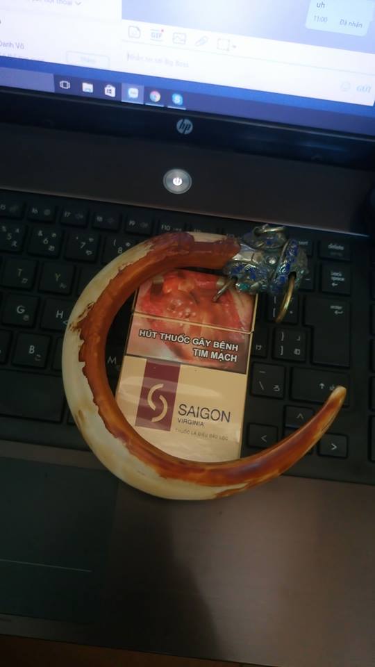 nanh heo, loại lớn siêu khủng bố, so sánh với chiếc hộp thuốc lá trong hình là thấy kích thước dữ dẵn của nó.