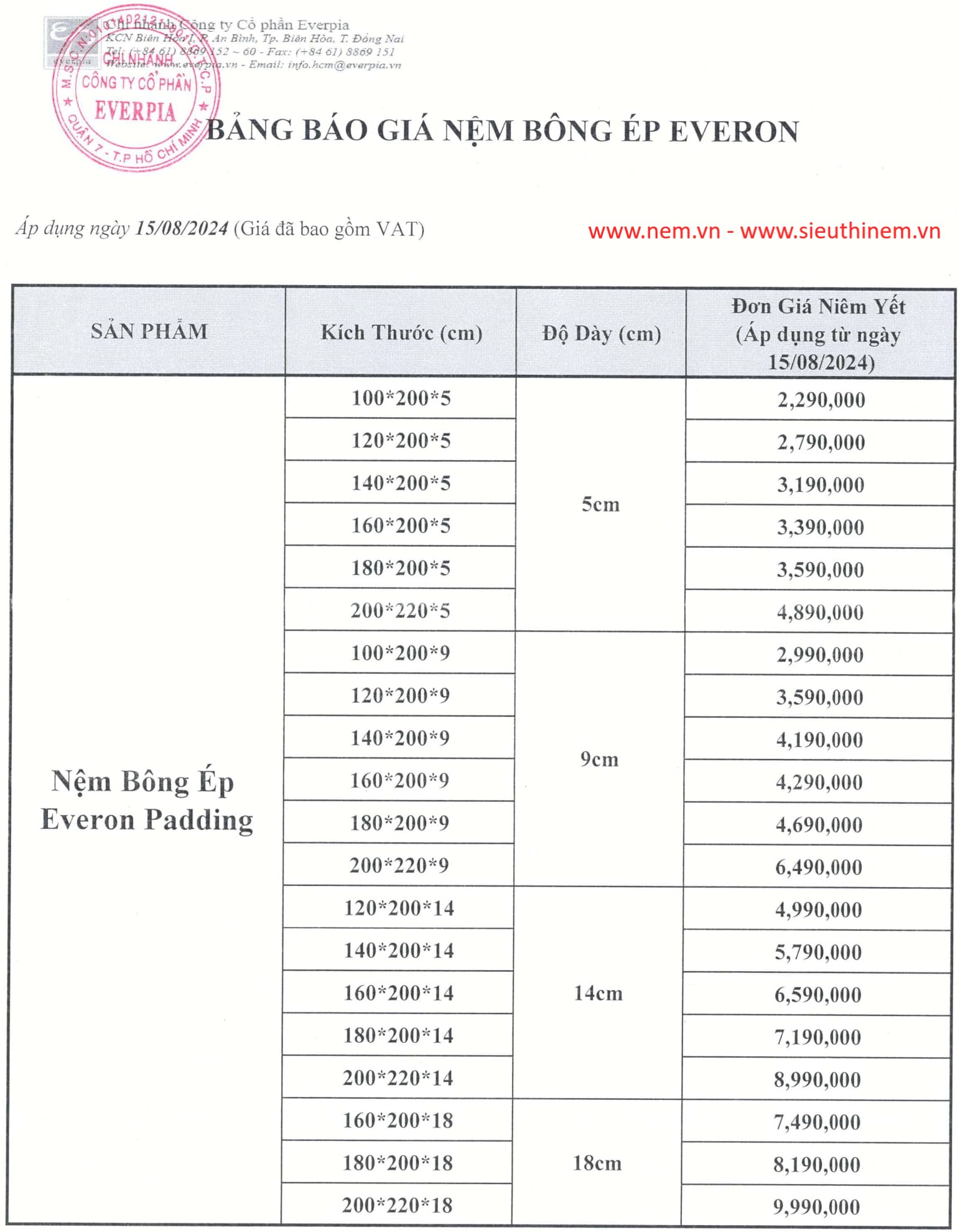 BẢNG GIÁ NỆM BÔNG ÉP EVERON PADDING ( 19.08.2024 )