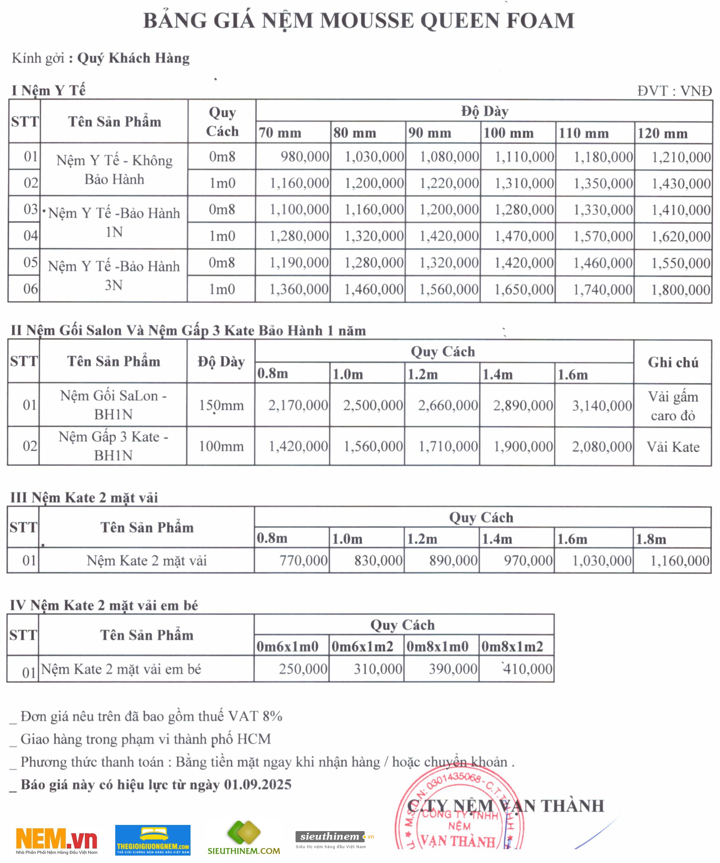 BẢNG GIÁ NỆM GẤP SOFA - VẠN THÀNH ( 29.11.2025 )
