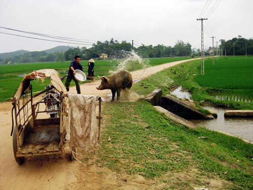 Cúp điện thoại, anh Hoàng vội vã xuống nhà bếp đưa rổ trứng vịt ra đập mấy quả vào chảo rồi trộn thêm một ít cám bưng ra cho chú lợn đực giống to nhất trong chuồng ăn. Vỗ vỗ mấy cái vào mông con heo đang ăn anh Hoàng "nói" với con lợn đực giống với giọng hí hửng: "Hôm ni nhất chú rồi đó! Ăn nhanh để ông dẫn đi tán gái...". Nói đoạn, anh Hoàng dắt chiếc xe ba gác ra buộc vào chiếc xe máy Cub50 dựng sẵn ngoài ngõ cũng là lúc con lợn đực giống ăn xong nhảy phắc lên chiếc xe bò đứng im để giữ thăng bằng rất chi là điệu nghệ. Cũng đúng thôi, vì nó đã cả ngàn lần "mần" việc này rồi. Anh Hoàng cười: "Cái giống con nhà họ Trư là vậy đó. Bẩm sinh nó có cái mũi nhạy cảm với cái mùi của "nái" lắm. Cách gần 100 mét nó đã có thể nhận ra "hơi" của bạn tình".