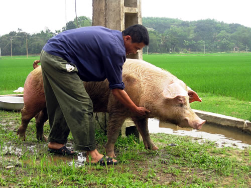 Chị Thảo không nói gì thêm, rút tiền trả cho anh Hoàng. Vui vẻ nhận tiền, anh Hoàng nổ máy chở heo về, nói với tôi: "Ở trong Nam thường gọi công việc của chú heo này là nhảy thất. Hà Tĩnh tụi tui gọi là đáp. Ra Bắc xa hơn gọi là phối giống. Gì thì gì, nội dung cũng thế thôi. Việc dẫn nuôi heo đực giống đang là một nghề sinh lãi cao nhưng cũng lên xuống thất thường. Cũng theo anh Hoàng, "nghề" đáp heo này đưa lại cho anh việc làm và nuôi 4 đứa con ăn học nhưng nghề này đôi lúc biến anh thành con nợ chồng chất. Nuôi lợn đực giống nó khác với nuôi các con vật khác cái rủi ro rất cao. Để có được một con lợn đực giống "có thương hiệu" thì phải đầu tư một số tiền lớn để chọn được giống lợn tốt. Chế độ dinh dưỡng ăn hàng ngày của lợn đực giống phải khác với lợn bình thường. Quá trình chăm sóc huấn luyện cho lợn hiểu và quen được sự chỉ đạo của con người cũng phải rất công phu. "Nuôi một con lợn đực giống từ khi mới nuôi đến khi đáp cho lợn cái được cũng phải mất 6 tháng và phải bỏ trên dưới chục triệu bạc. Nó sống suôn sẻ thì vài năm là giàu nhưng gặp phải năm bệnh tật nó chết thì cũng trắng tay, nợ nần...", anh Hoàng tâm sự.