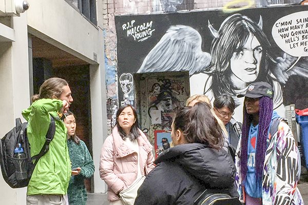 Cậu hướng dẫn xưng tên là Andreas, nói mình tốt nghiệp cử nhân khoa học, Đại học Melbourne, đưa chúng tôi đi băng qua các đường phố lớn, rấn bước vô những con hẻm của trung tâm Melbourne, nơi có cái gọi là “nghệ thuật đường phố”.