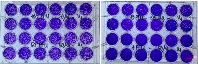 | Ảnh chụp các giếng thử nghiệm về sự hình thành vết tan của virus SARS-CoV-2 trên tế bào Vero E6 khi thử nghiệm với thuốc VIPDERVIR. Ảnh: Viện Công nghệ sinh học |