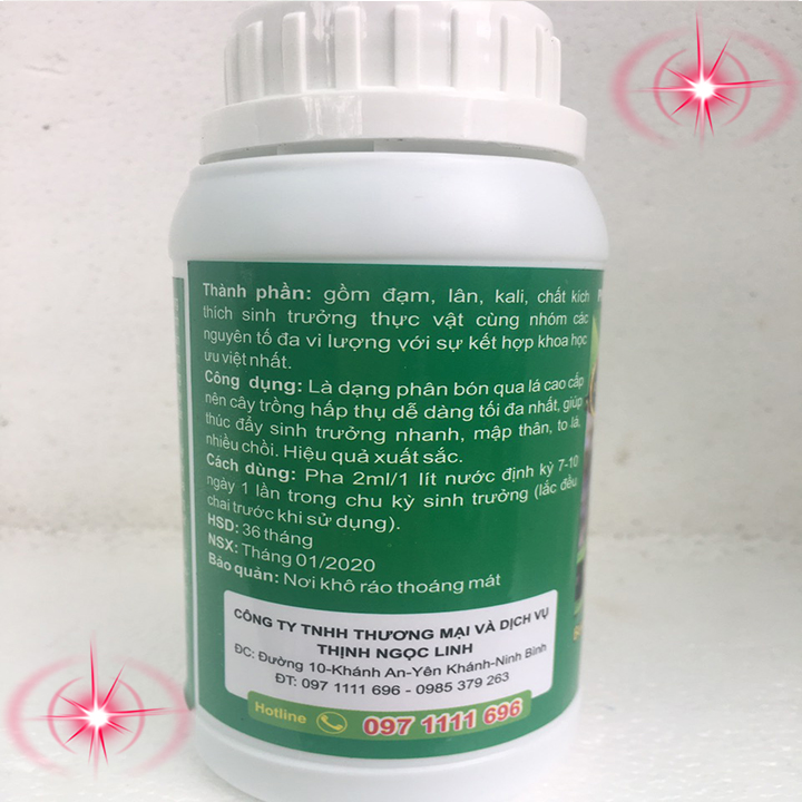 Ngọc Linh A5 phân bón thúc đẩy sinh trưởng125.000₫Sản phẩm sắp có hàngBạn có thể xem các sản phẩm tương tự.Xem Sản Phẩm Tương TựMô tả sản phẩmNgọc Linh A5 phân bón thúc đẩy sinh trưởngDung tích :250ccThành Phầm :gồm đạm lân kali chất kích thích sinh trưởng và các nguyên tố đa vi lượngCông dụng : dạng phân bón qua lá cao cấp nên giúp cây trồng hấp thụ dễ dàng và tối đa giúp cây thúc đẩy sinh trưởng nhanh mập than to lá nhiều chồi Cách sử dụng : 2cc /1lit nước phun dịnh kì 7-10 ngày một lần trong quá trình sinh trưởngBảo quản :nơi khô ráo thoáng mát Hạn sử dụng : 36 tháng