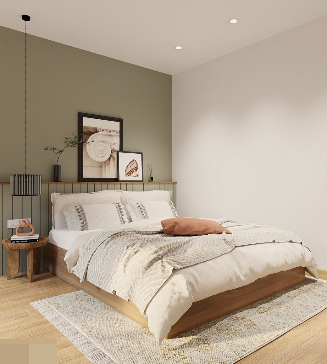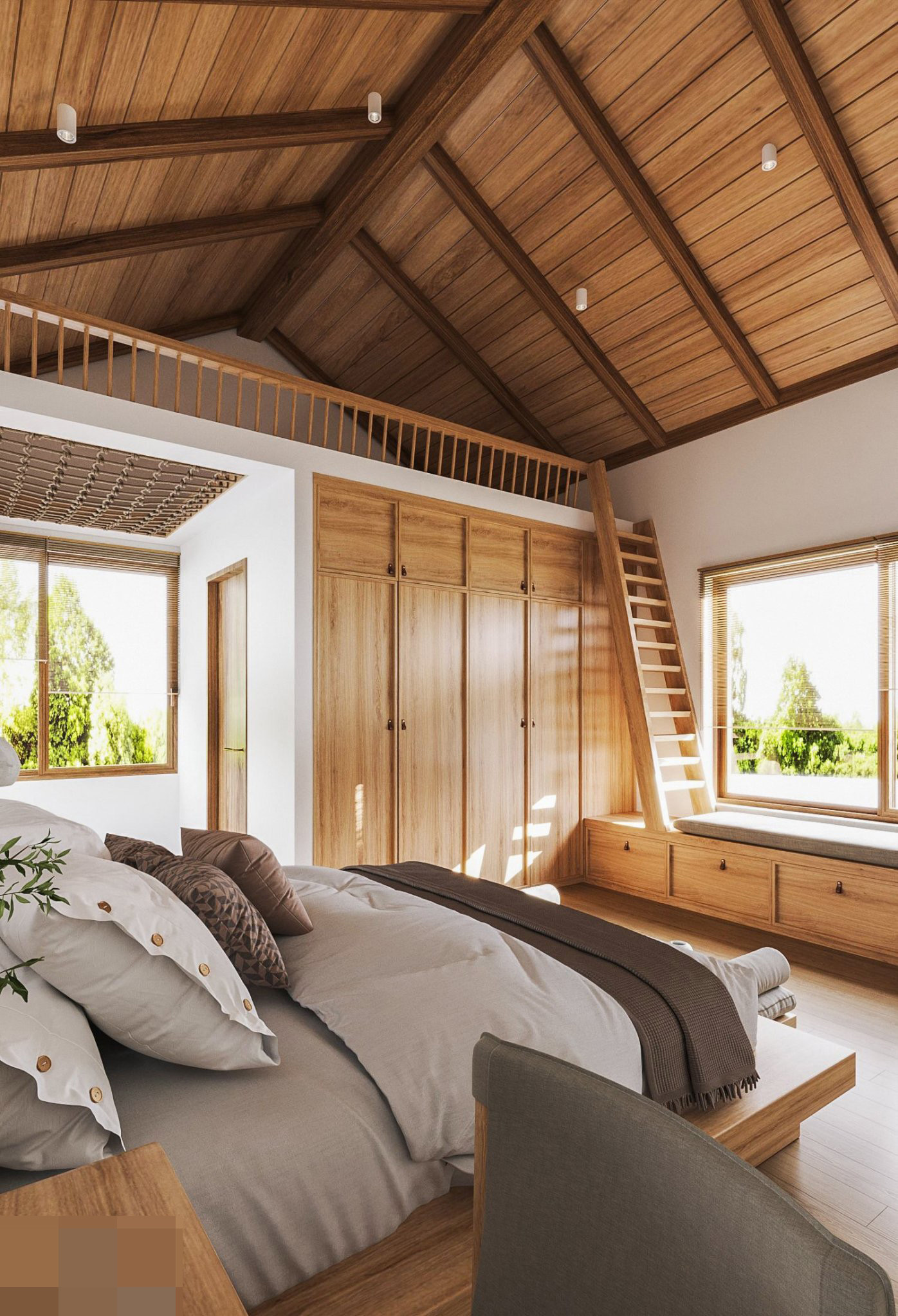 Hai phòng ngủ ở tầng 1 và tầng 2. Hệ thống tường lấy màu trắng hoặc màu trắng gạo làm chủ đạo, thêm chút màu xanh nhấn nhá. Sàn nhà và đồ dùng trong nhà giữ nguyên màu gỗ tự nhiên.
