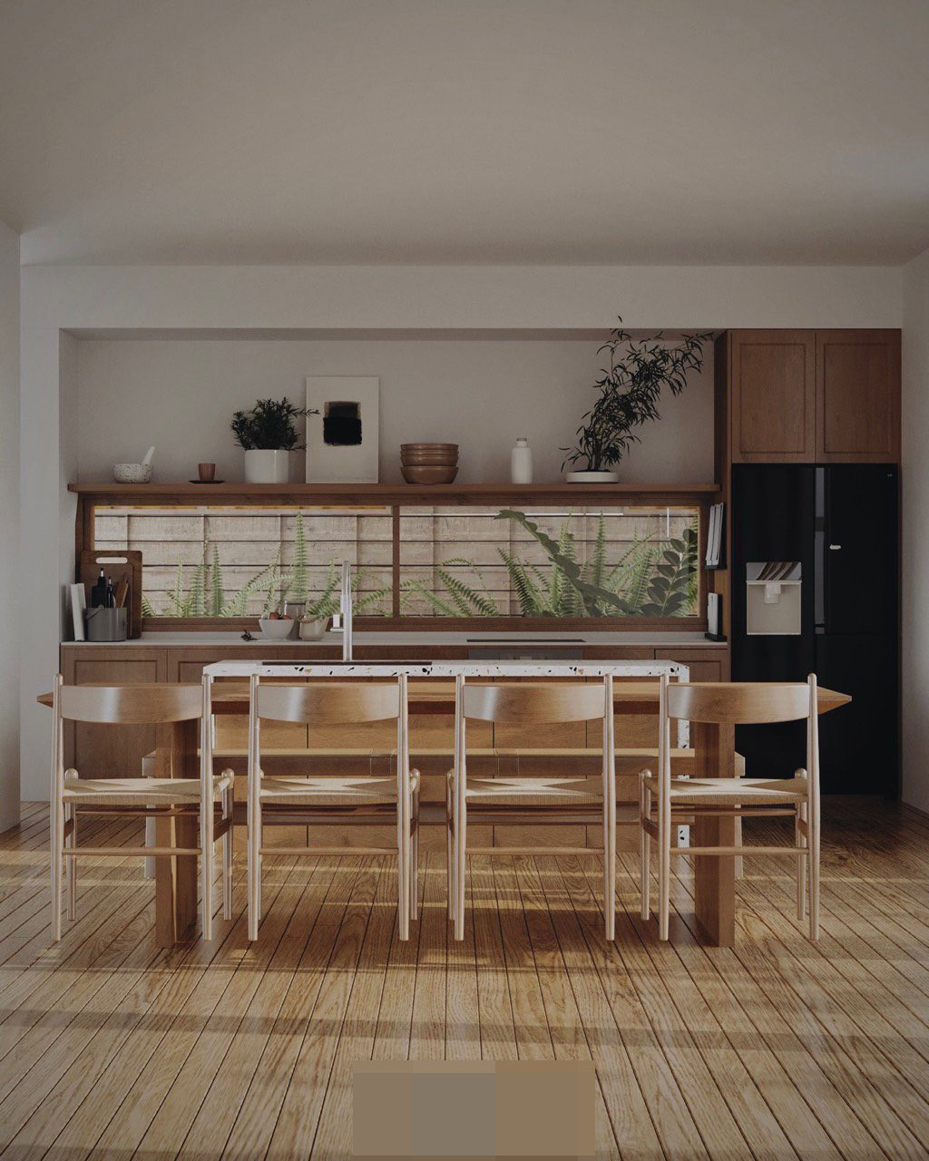 Toàn bộ sàn nhà được lát gỗ giúp không gian mộc mạc. Đặc điểm của gỗ là mát vào mùa hè và ấm vào mùa đông, vì vậy sàn gỗ không chỉ mang đến thẩm mỹ mà còn tốt cho sức khỏe gia chủ.