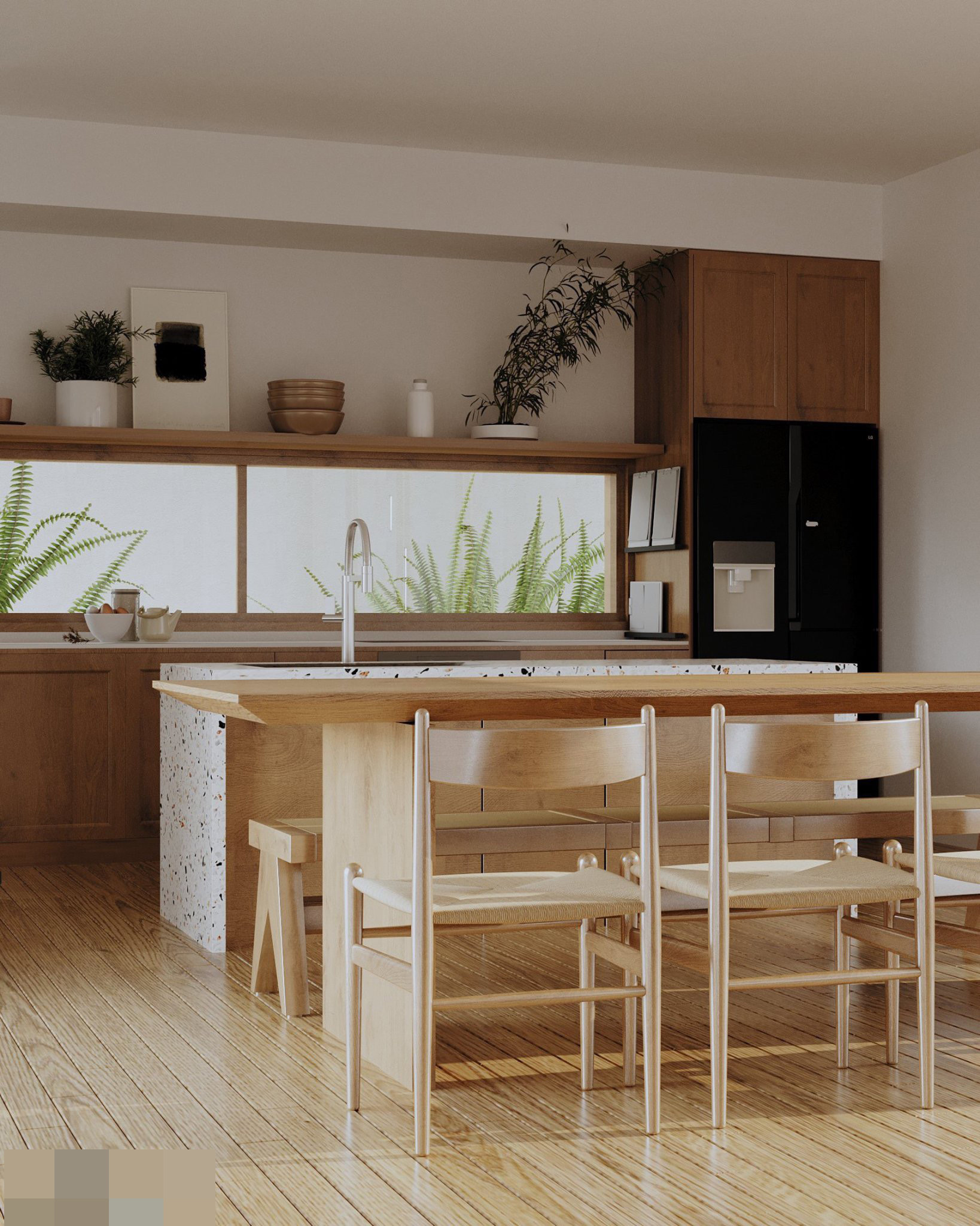 Nội thất với tông màu chủ đạo là gỗ và trắng mang đến sự ấm áp mộc mạc và trong trẻo, điểm một chút màu xanh pastel nhẹ nhàng làm không gian nội thất nhìn mát mẻ.