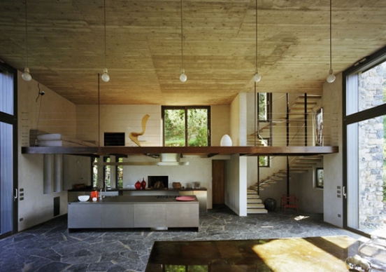 Phòng khách với cửa sổ rộng đón giá và ánh sángTrái ngược với vẻ bề ngoài nặng nề của mình, ngôi nhà lại khá thoàng và mát mẻ nhờ vào vị trí sườn đồi và cách bố trí những cánh cửa kính cao sát trần để thu nhận nguồn ánh sáng ban ngày được tối đa. Trần nhà bằng bê tông, một số phòng được để nguyên vẻ thô mộc của vật liệu còn một số phòng được ốp bằng gỗ, nhưng cũng là loại gỗ tự nhiên thô mộc.