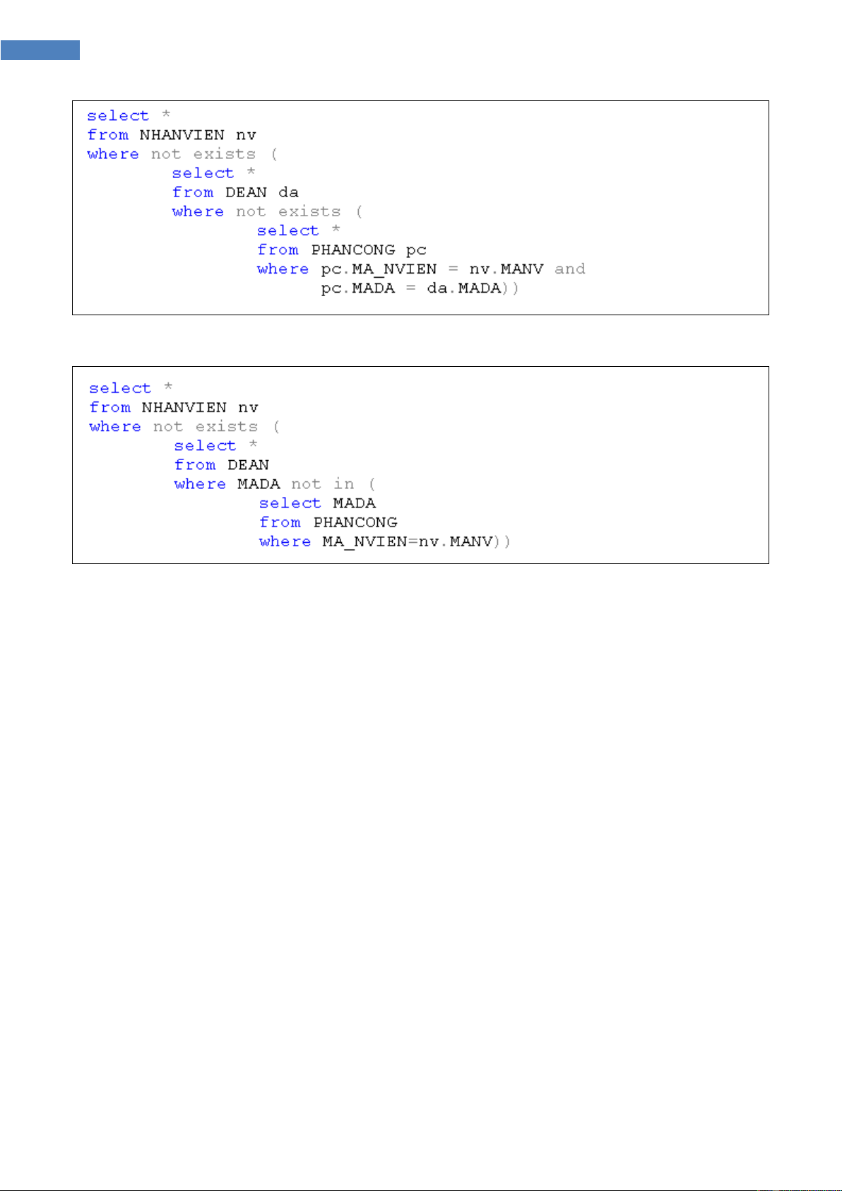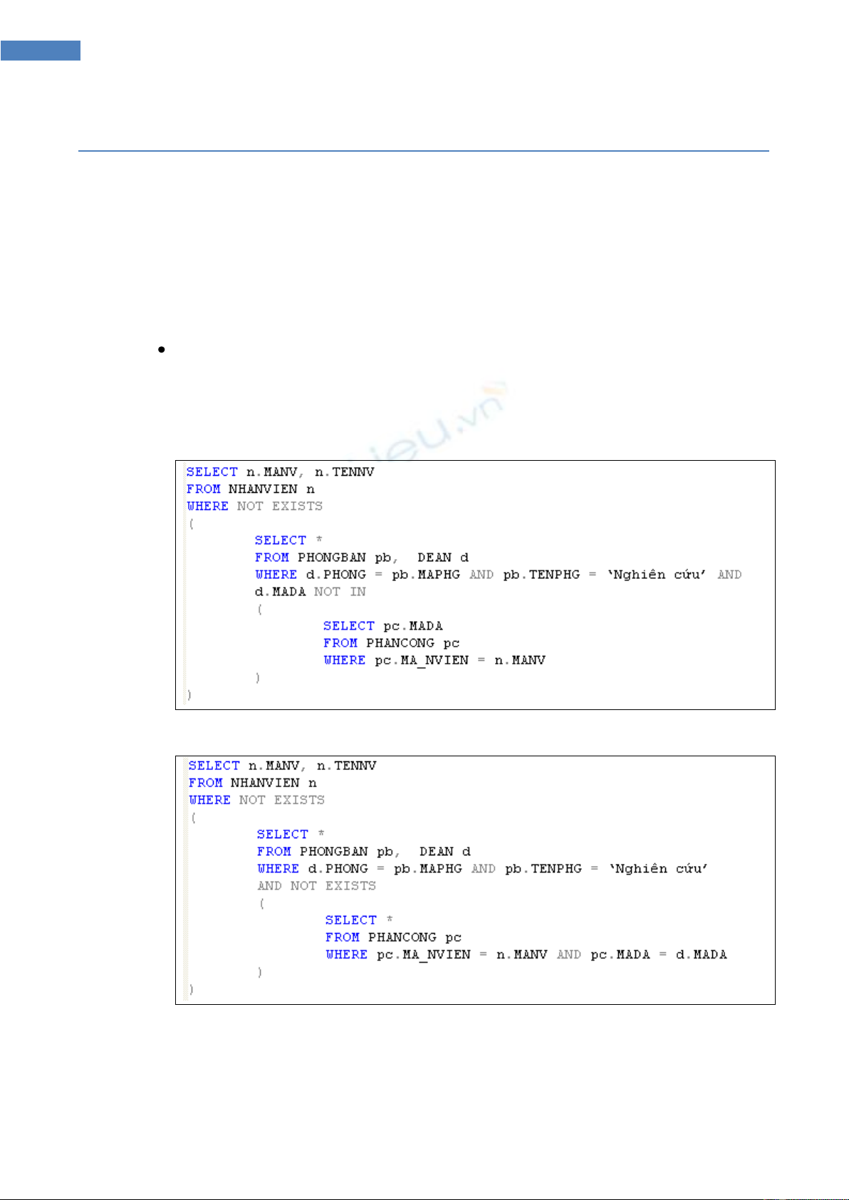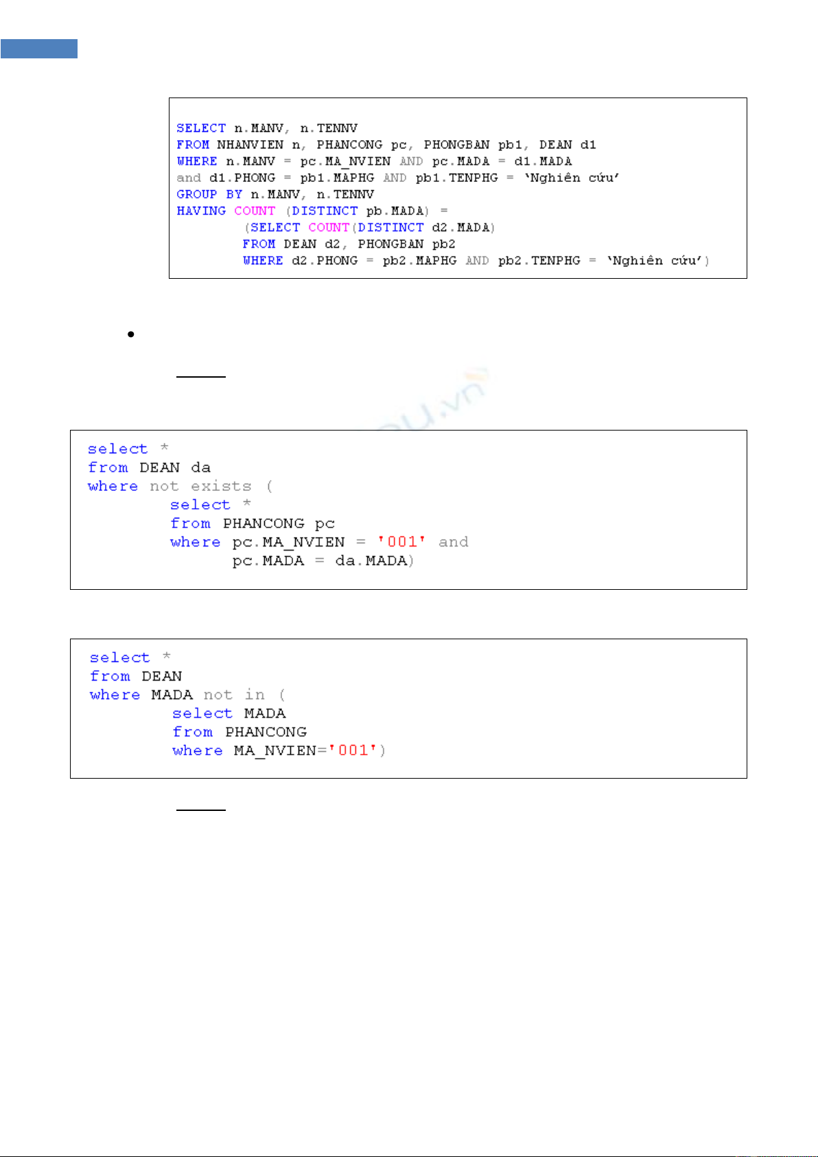 Mạng xã hội chia sẻ tài liệu Upload Đăng nhập Nâng cấp VIP Trang chủ » Công Nghệ Thông Tin » Hệ thống thông tin quản lý3 trang 844 lượt xem 560 Ngôn ngữ SQL – Phép chiaCó 2 cách thực hiện: Cách 1: Sử dụng NOT EXISTS + NOT IN hoặc NOT EXISTS + NOT EXISTS Cách 2: Sử dụng mệnh đề GROUP BY + HAVING VD: Tìm nhân viên được phân công làm việc trong tất cả các đề án do phòng Nghiên cứu quản lí...
