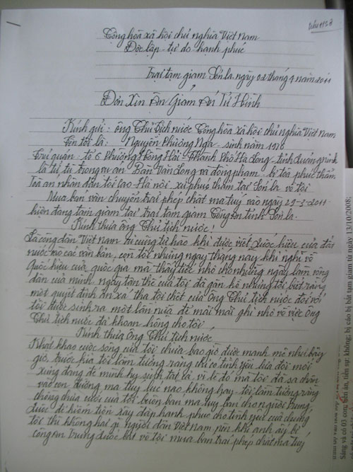 Lá đơn xin ân xá của Nguyễn Thị Phương Nga