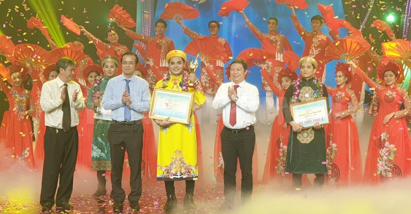 Phó Chủ tịch UBND TPHCM Dương Anh Đức và Phó trưởng ban Thường trực Ban Tuyên giáo Thành ủy TPHCM Lê Văn Minh trao danh hiệu Chuông Vàng Vọng cổ 2020 cho thí sinh Nguyễn Quốc Nhựt.(Thanhuytphcm.vn) - Tối 27/9, tại Nhà hát Truyền hình TPHCM (Quận 1), cuộc thi Chuông Vàng Vọng cổ 2020 - lần XV đã diễn ra đêm chung kết xếp hạng với sự tranh tài của ba thí sinh Nguyễn Quốc Nhựt (Long An), Võ Hoàng Dư (Long An) và Lê Văn Hậu (An Giang).