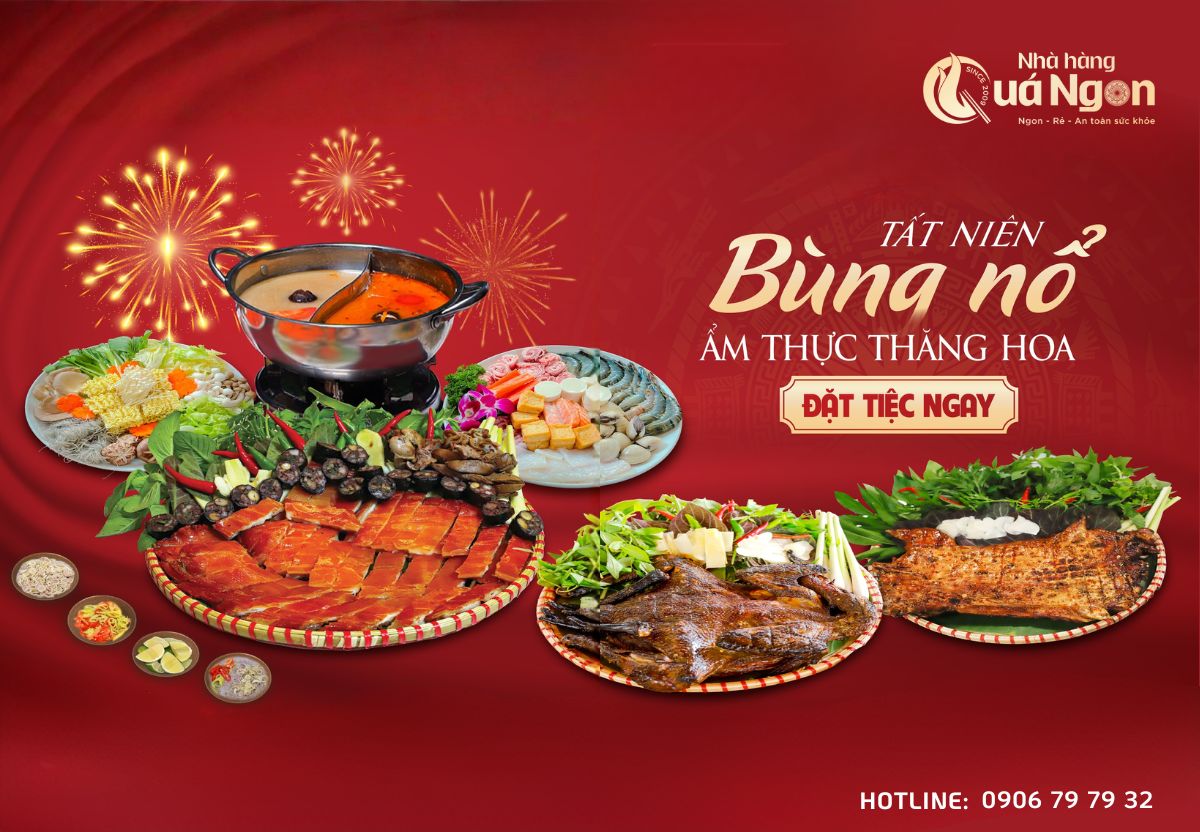 💥 Nhà hàng Quá Ngon là thương hiệu nổi tiếng hơn 16 năm nay với đặc sản ĐỆ NHẤT HEO TỘC QUAY LU CHẶT MẸT và món LẨU VUA trứ danh. Ngoài hai món này, Nhà hàng còn có 14 món hải sản, đặc sản hấp dẫn khác. Chi tiết các món ăn, giá cả, cách thức phục vụ… Quý khách vui lòng click vào từng món ăn để xem thông tin chi tiết.