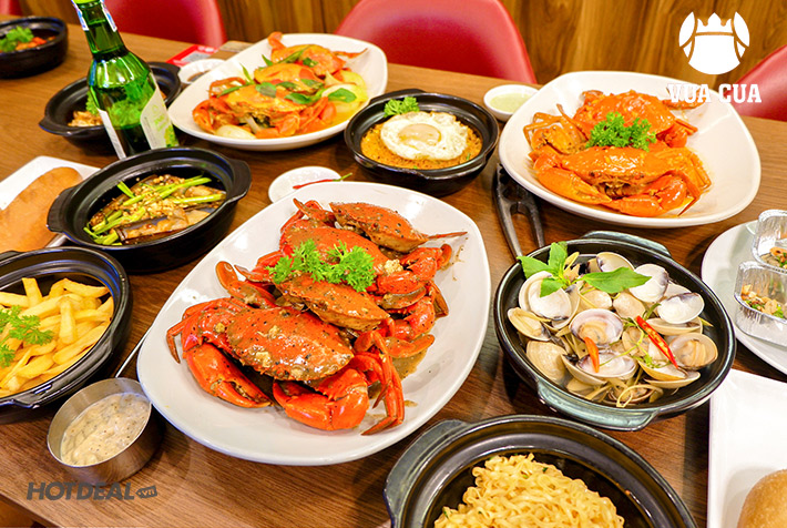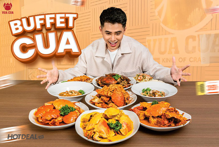 Với ưu đãi lần này từ Hotdeal, đến Vua Cua, bạn sẽ được thưởng thức đại tiệc buffet cua và các món dùng kèm được gọi thả ga không giới hạn, gồm: 3 con cua Cà Mau, Hàu nướng mỡ hành, Nghêu hấp sả, Ốc móng tay xào rau muống, Khoai tây chiên đút lò phô mai, Mì trộn bơ tỏi, Mì Ý sốt trứng muối, Cơm chiên trứng ốp la, Salad măng tây, Miến xào rau, Bánh mì.
