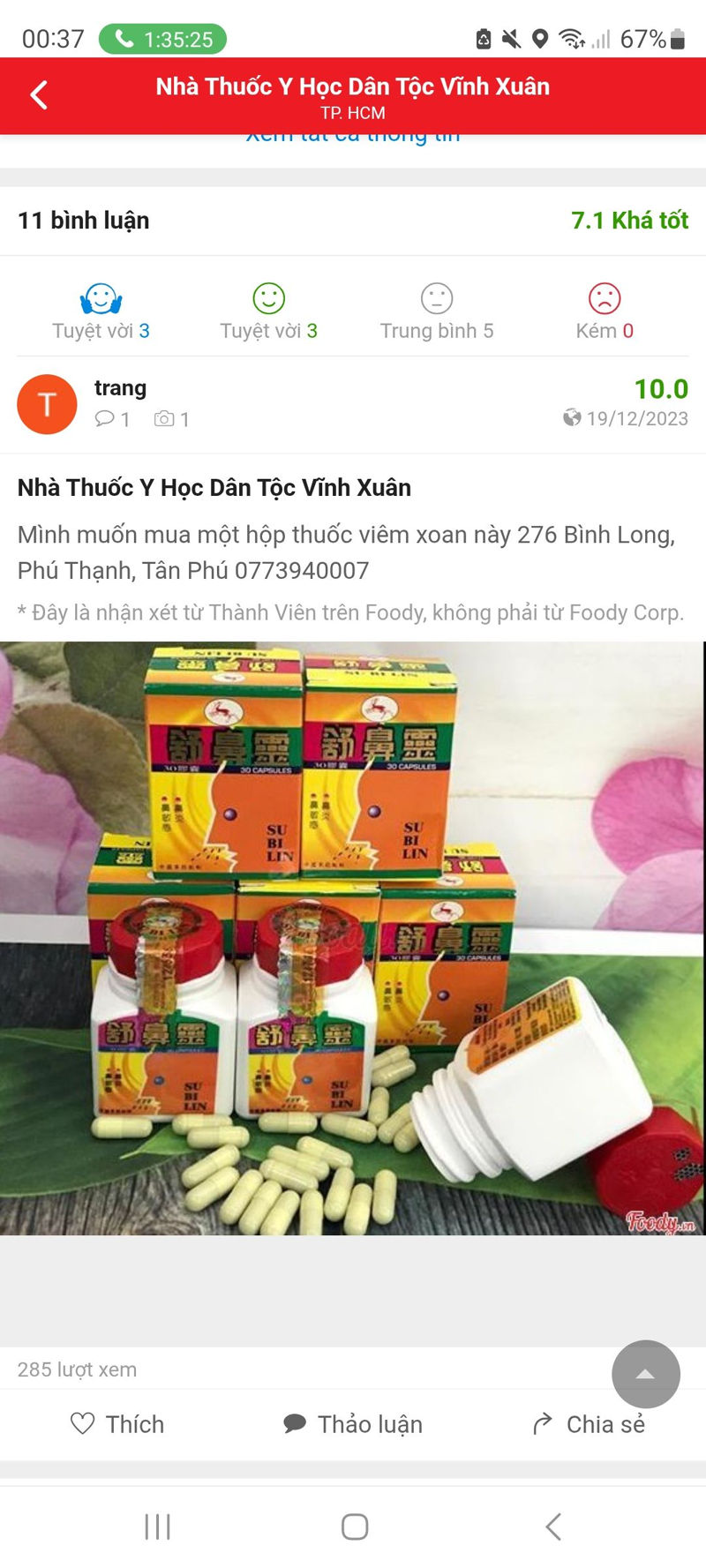 trang đã bình luận bằng Web 19/12/2023 15:05:42, 10 Nhà Thuốc Y Học Dân Tộc Vĩnh Xuân Mình muốn mua một hộp thuốc viêm xoan này 276 Bình Long, Phú Thạnh, Tân Phú 0773940007 ...Xem thêm