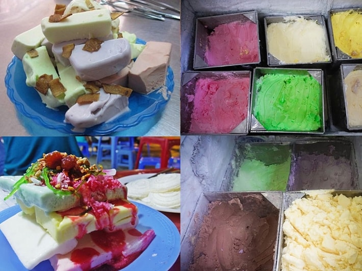 Cuối cùng thứ không thể bỏ qua chính là món kem cân. Kem cân có đủ các vị từ sữa dừa, cốm cho đến dâu, khoai môn. Thêm mấy miếng dừa khô thì kem chưa kịp chảy đảm bảo đã hết vèo..