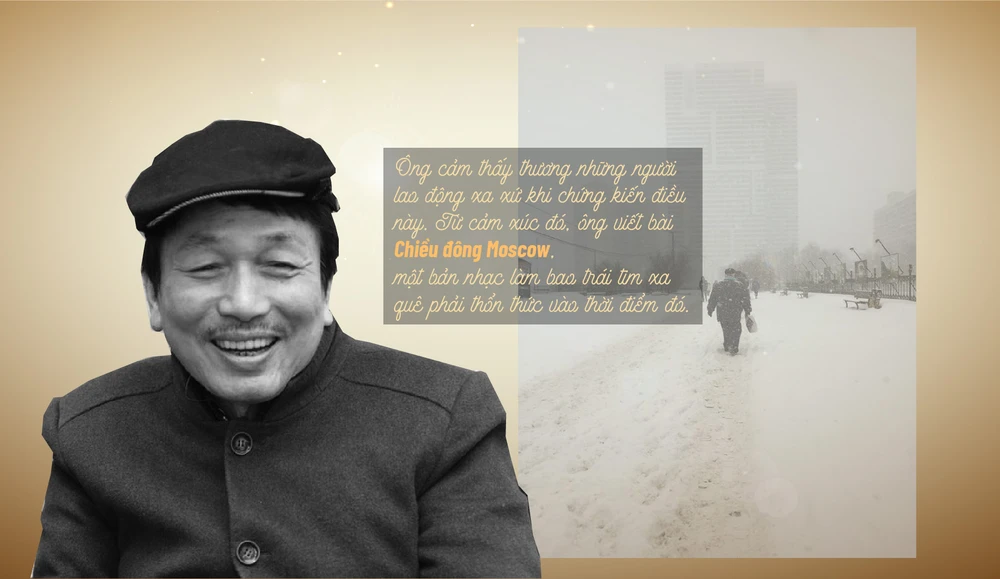 Trong chương trình, MC Quyền Linh đã vui mừng nhắc về những kỷ niệm đáng nhớ. Anh kể, lần ấy ghé thăm nhà nhạc sĩ Phú Quang, anh được đón tiếp như một người thân trong gia đình. Đặc biệt, anh còn được nghe nhạc sĩ Phú Quang đàn và hát ngay tại nhà. Khi được Quyền Linh nhắc về bản nhạc nổi tiếng Chiều đông Moscow, nhạc sĩ Phú Quang nghẹn ngào kể câu chuyện phía sau sáng tác ấy khiến nhiều người xúc động. Nhạc sĩ cho biết, năm đó ông có chuyến đi Moscow, được dịp tham quan một khu chợ trời, ghé lại mua hàng của một người Việt sang đây sinh sống.