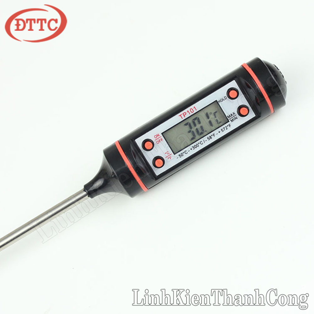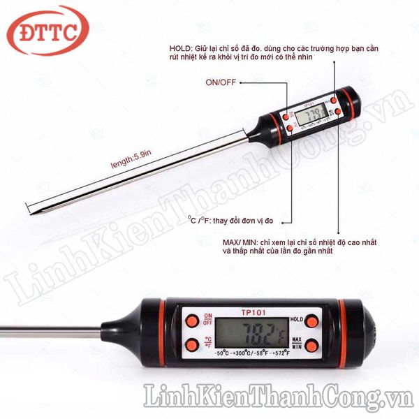 - TP101 được thiết kế riêng dành cho việc đo nhiệt độ thực phẩm, đo nhiệt độ của nước (nhiệt độ của chất lỏng) với độ chính xác cao. Nhiệt độ được ghi nhận và hiển thị trên thân nhiệt kế.