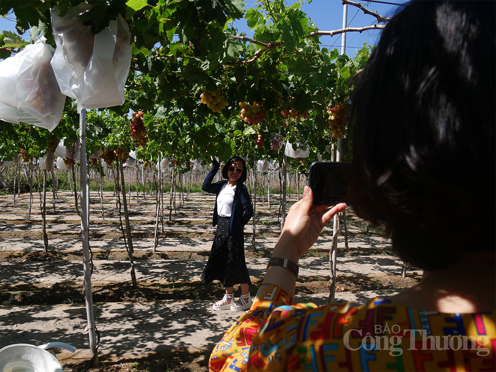 | Khách du lịch đến tham quan và chụp ảnh tại vườn nho |