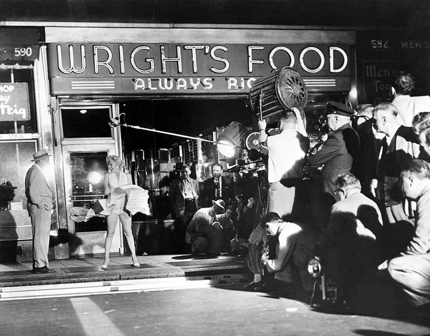 Marilyn Monroe quay cảnh phim In The Seven Year Itch. Bức ảnh này được chụp tại New York trong một đám đông lớn, năm 1954.