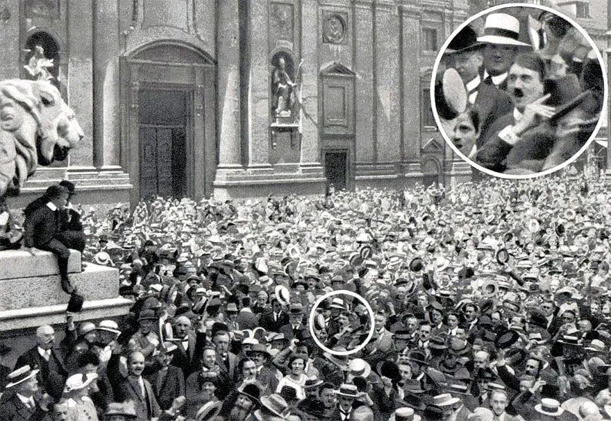 Bức ảnh vô tình chụp được khoảnh khắc Hitler thời còn trẻ vui mừng khi thế chiến thứ I nổ ra.