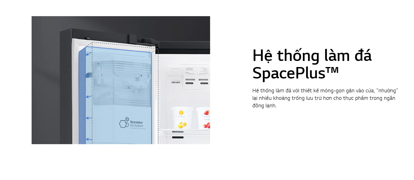 Ngoài việc lấy nước dễ dàng nhờ hộc lấy nước ngoài cửa tủ, người dùng cũng có thể dễ dàng lấy đá tại đây, nhờ vào việc nhà sản xuất trang bị hệ thống làm đá tự động Spaceplus (được gắn bên trong cánh cửa tủ) một cách nhanh chóng và dễ dàng.
