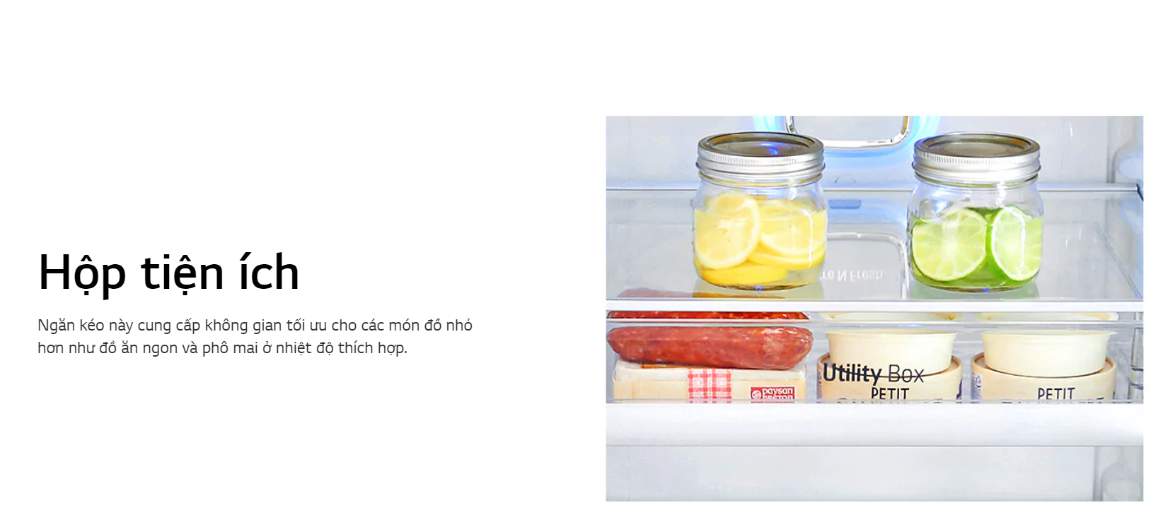 Đối với những thực phẩm ăn nguội như pho mát, thịt nguội, đồ ăn vặt thì tủ lạnh LG GR-X247JS/MC có riêng một ngăn chứa chuyên biệt để bảo quản có tên là ngăn Ultility Box. Điều này không chỉ giúp cho thực phẩm được bảo quản ở nhiệt độ thích hợp mà còn giúp chúng không bị lẫn mùi với thực phẩm tươi sống, chống nhiễm khuẩn, bảo vệ sức khỏe gia đình bạn và giữ nguyên được độ thơm ngon khi thưởng thức.
