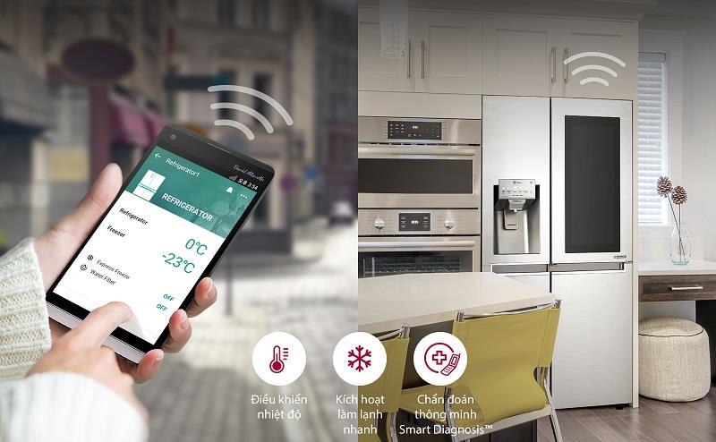 Sản phẩm được ứng dụng công nghệ thông minh Smart ThinQ TM, do đó chỉ với một chiếc SmartPhone, người dùng có thể kiểm soát được nhiệt độ tủ lạnh, kích hoạt làm lạnh nhanh, đồng thời có thể chẩn đoán được tình trạng của tủ lạnh hay điều chỉnh 1 số cài đặt của tủ lạnh ngay trên tủ lạnh như: Tăng giảm nhiệt độ các ngăn, bật tắt chế độ làm đông nhanh.