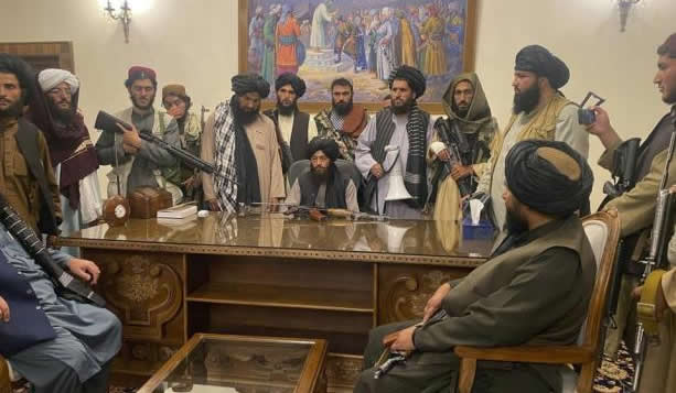 | Các thủ lĩnh của Taliban bên bàn làm vệc của Tổng thống Afghanistan sau khi chiếm được Kabul. Ảnh: AP |