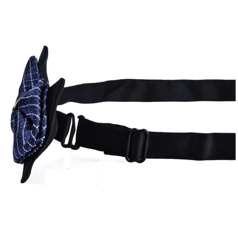 - Nơ cài cổ áo Nam thiết kế 2 lớp với lớp trước là hoa văn màu Xanh navy kẻ ô đính hạt đá và lớp nền sau màu đen làm nổi bật hoa văn nơ.