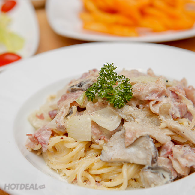 2/ + 01 Mỳ Ý sốt kem thịt xông khói và nấm