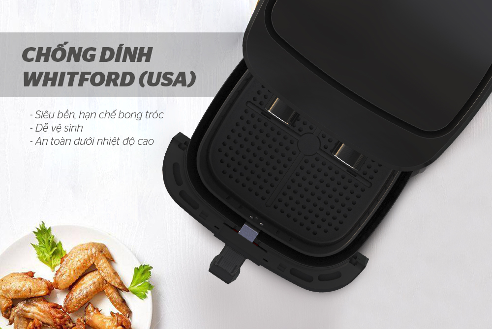 Sản phẩm được phủ chống dính cao cấp Whitford (USA) siêu bền, không những hạn chế cháy khét mà còn chống bám dính thực phẩm, dễ dàng vệ sinh. Các bộ phận này cũng có thể vệ sinh bằng máy rửa bát, tiện lợi hơn cho người dùng.