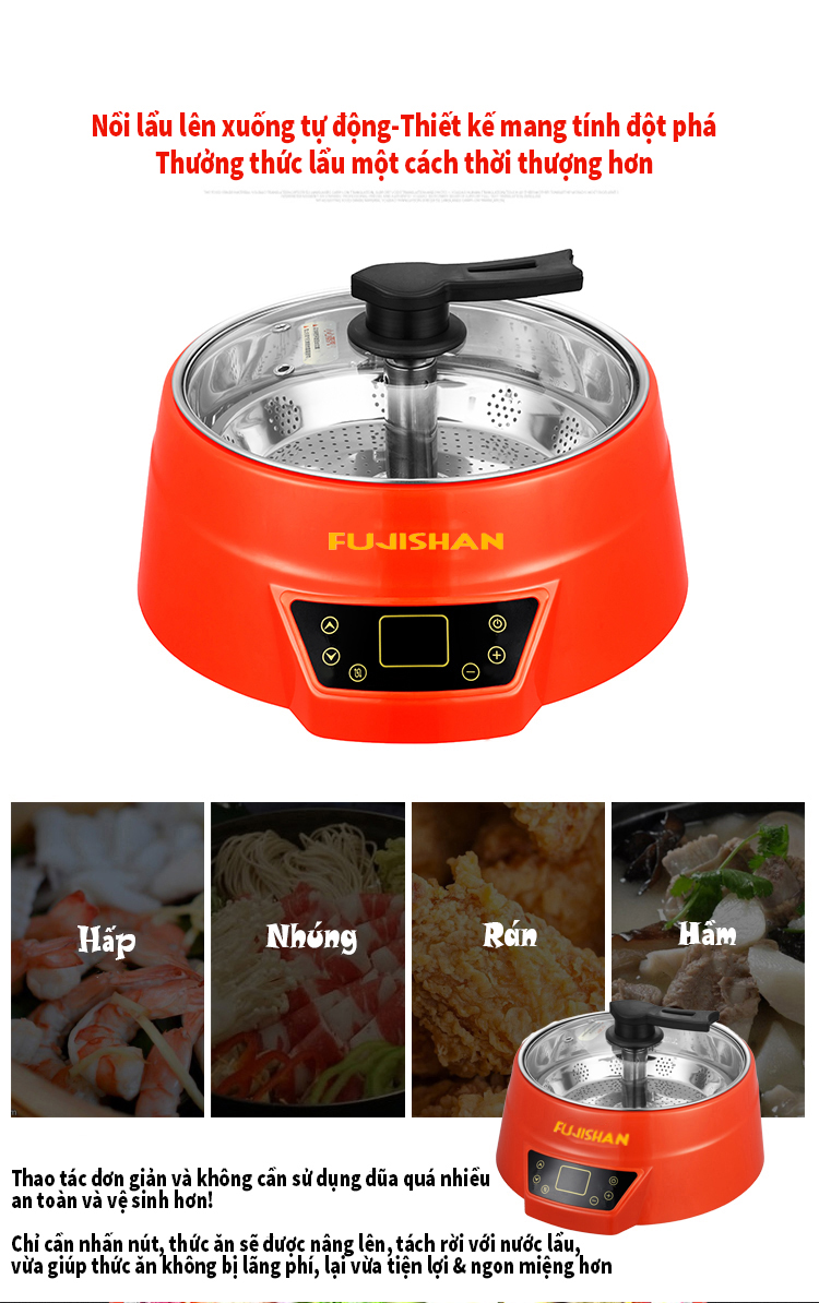 Sau đây tôi xin giới về sản phẩm nồi lẩu nâng hạ thông minh Fujishan . Với thiết kế thông minh có thể điều chỉnh độ cao của khay đựng thức ăn theo ý muốn giúp bạn tiện lợi trong những bữa tiệc lẩu gia đình, giúp đảm bảo độ dinh dưỡng của thức ăn, cũng nhờ có thiết kế thông minh như vậy mà nồi có thể giúp bạn thực hiện cơ số tác vụ khác trong nhà bếp ví dụ như : hấp đồ ăn, chiên xào, đồ xôi, …vv…