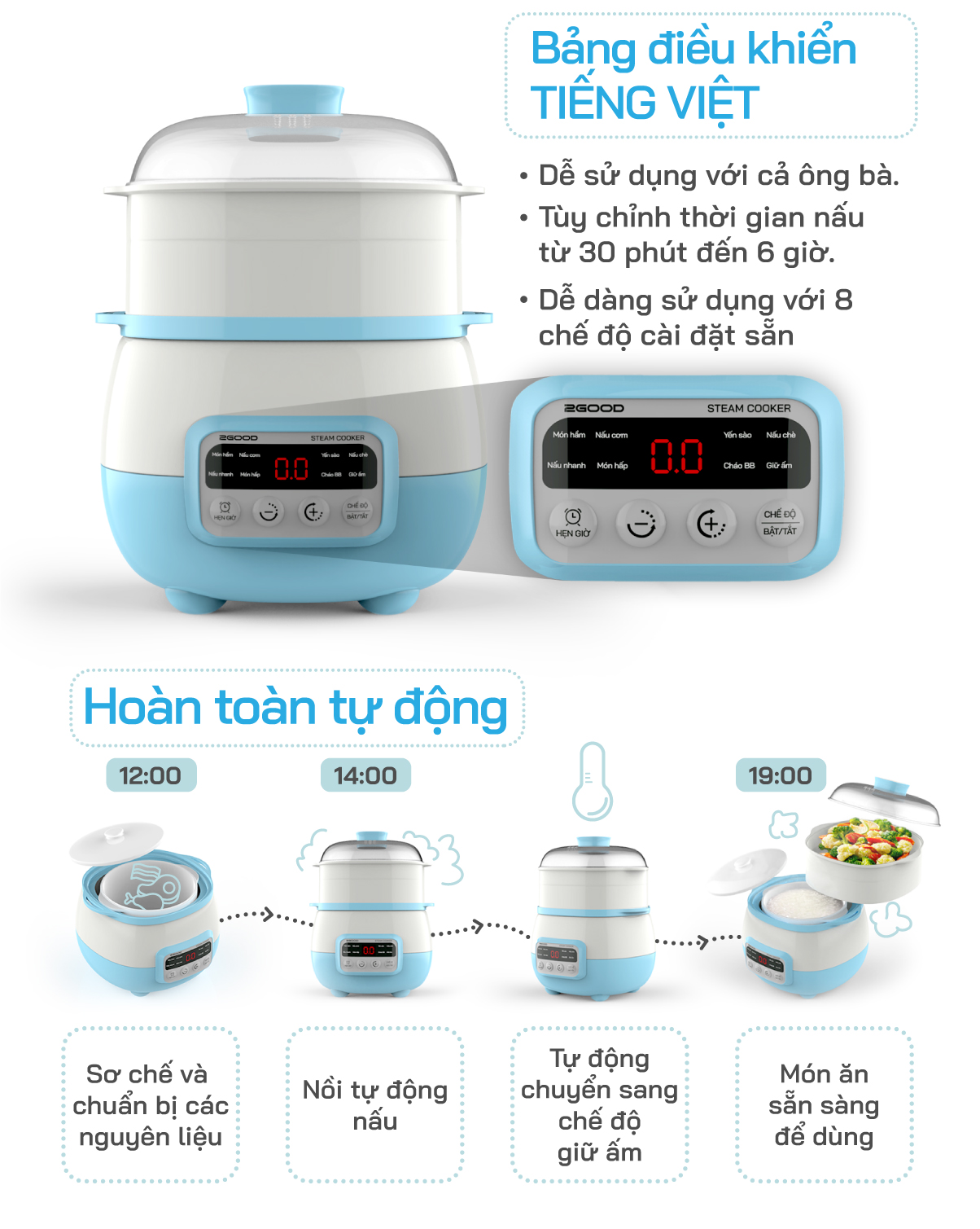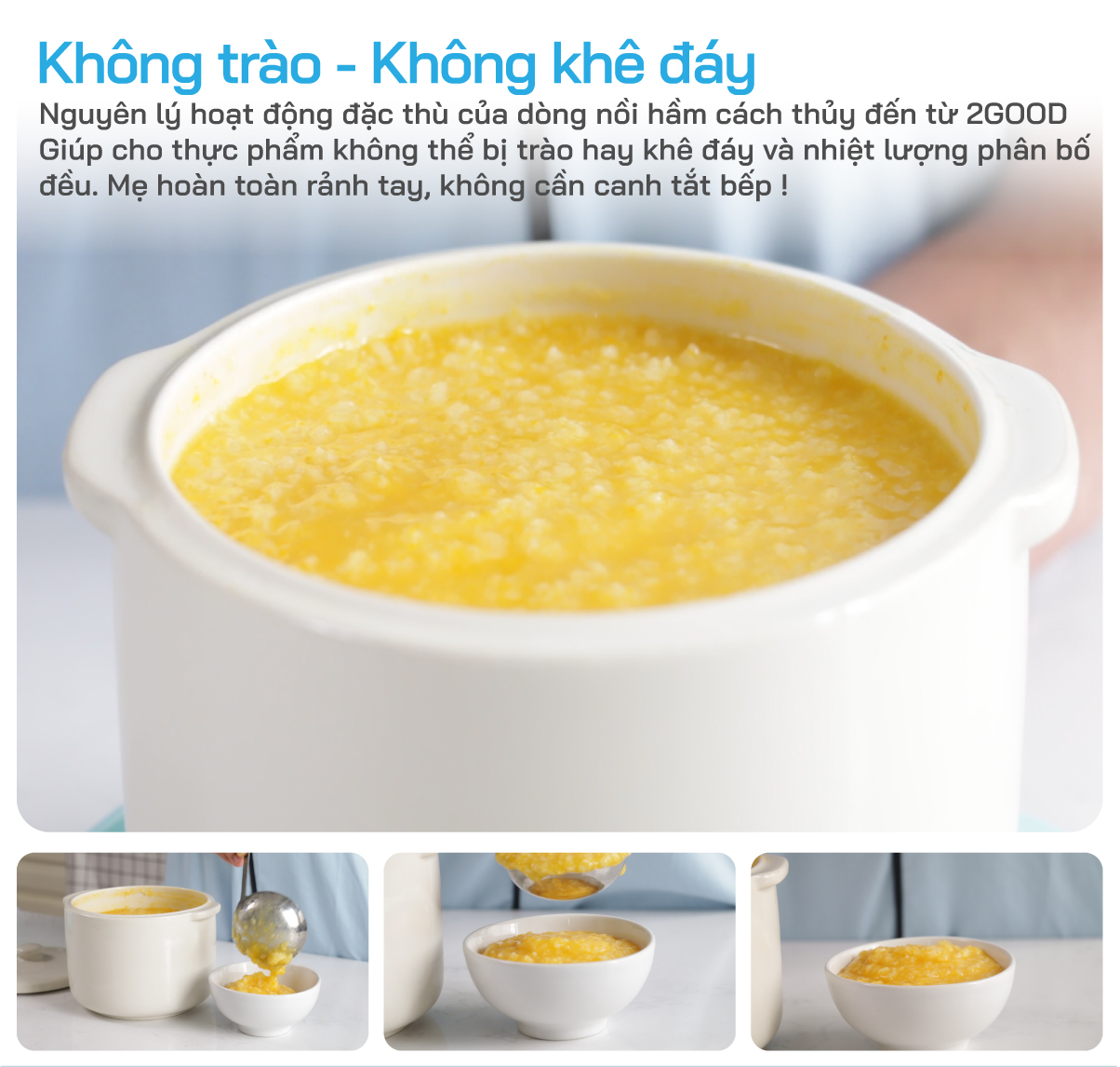 1. Khi nấu, cháo sánh dẻo, hạt gạo nở bung, vẫn còn mùi thơm tự nhiên 2. Khi nấu tuyệt đối không trào, không phải canh bếp, nấu xong tự chuyển sang chế độ Giữ Ấm 3. Sau khi nấu xong, không bị tình trạng vữa cháo, chảy nước như khi đựng lâu trong nồi cơm điện. Giữ cháo trong lòng nồi 2GOOD giúp cháo thơm ngon như mới nấu Suốt cả ngày. 4. Nồi điều khiển điện tử (hẹn giờ) phiên bản Tiếng Việt, dễ sử dung ngay cả cho người lớn tuổi 5. Khi cạn nước, Nồi 2GOOD sẽ tự động tắt, chống cháy, chống khê, an toàn khi sử dụng trong gia đình 6. Có Bảng điều khiển hẹn giờ nấu tùy chỉnh thông minh, cho phép tự đặt giờ nấu phù hợp với món ăn yêu thích 7. Đa dạng trong sử dụng: Nấu cháo/Hầm xương/ Tiềm gà/Chưng yến/ Vi cá/ Nấu chè/ Kho thịt,cá/Hấp rau củ/Làm bánh,.8. Tay cầm cách nhiệt đa năng, tháo rời với niêu sứ mà không cần chạm vào niêu