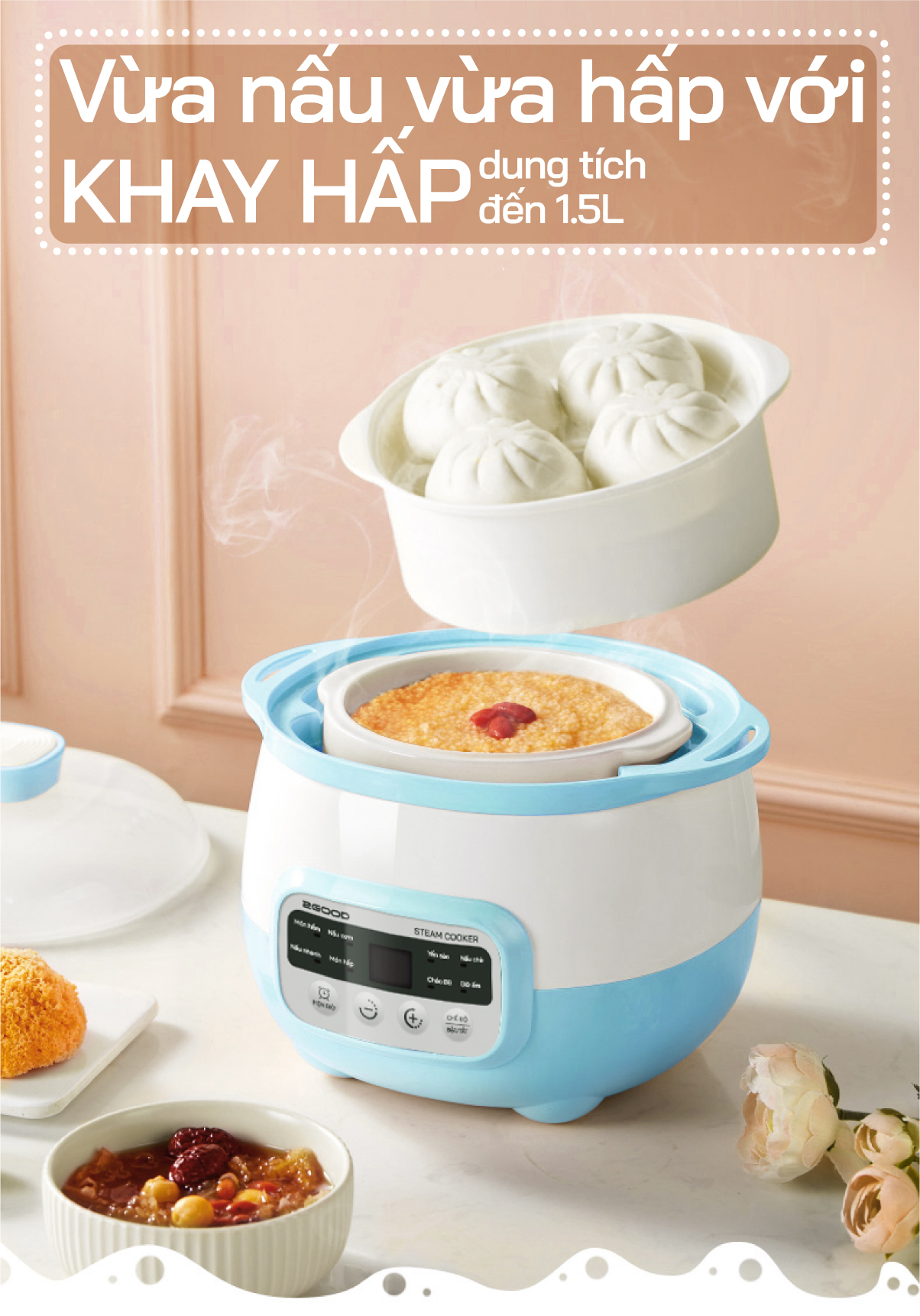 *** Thành phần Nồi 1. Nắp nhựa chịu nhiệt không chứa BPA 2. Lòng gốm 1,6L dễ vệ sinh, an toàn cho sức khỏe 3. Bảng điều khiển thông minh Tiếng Việt, dễ sử dụng ngay cả với người lớn tuổi 4. Màn LED hiển thị Thời Gian 5. Chức năng đặc biệt Hẹn giờ nấu, Cho phép Sáng đặt Trưa Ăn; Sáng đặt Tối ăn; Tối đặt Sáng ăn6. Khay hấp thể tích: 1,5L