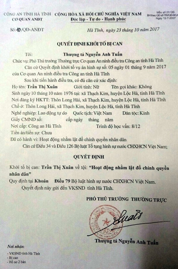 Như tin đã đưa, Cơ quan An ninh điều tra (ANĐT) CA tỉnh Hà Tĩnh vừa ra quyết định khởi tố bị can, thực hiện lệnh bắt tạm giam đối với Trần Thị Xuân (1976, trú thôn Long Hải, xã Thạch Kim, H. Lộc Hà, Hà Tĩnh) về hành vi “Hoạt động nhằm lật đổ chính quyền nhân dân” Quy định tại Điều 79, Bộ luật Hình sự nước CHXHCN Việt Nam. Trước đó, ngày 1-9, Cơ quan ANĐT CA tỉnh Hà Tĩnh đã khởi tố vụ án “Hoạt động nhằm lật đổ chính quyền nhân dân” để điều tra. Quá trình điều tra, ngày 17- 10, Cơ quan ANĐT đã thực lệnh bắt khẩn cấp đối với Trần Thị Xuân.