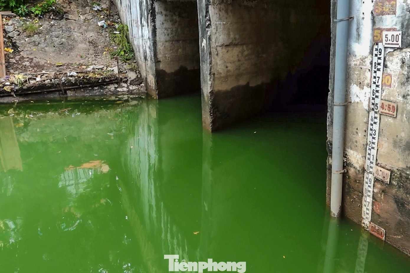 | Ghi nhận mực nước sông Tô Lịch đoạn qua đầu đường Hoàng Quốc Việt đo được trong sáng nay là 3,5 mét. |