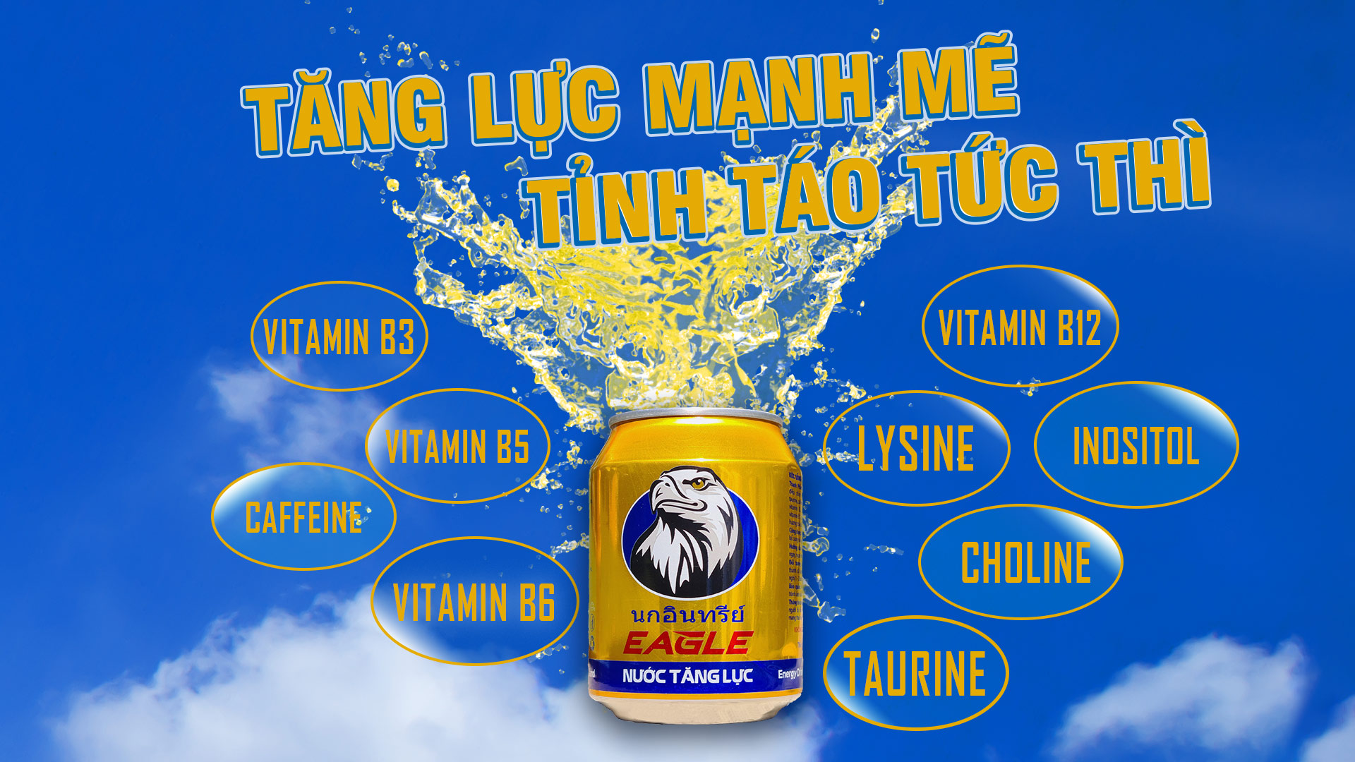 EAGLE: Nước Tăng Lực Đại Bàng – Ngập tràn năng lượng. Đã có mặt tại Việt Nam. Nước Tăng Lực Đại Bàng với tổng hợp các vitamin và khoáng chất, bổ sung năng lượng, giúp cơ thể tỉnh táo, không mệt mỏi. Nhãn hiệu uy tín, chất lượng, đạt top 10 thương hiệu mạnh Asean, được rất nhiều khách hàng lựa chọn và tin dùng