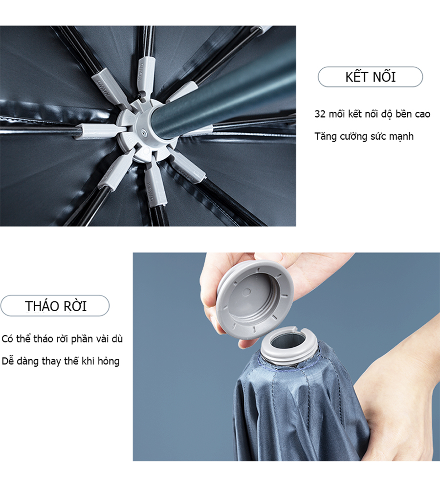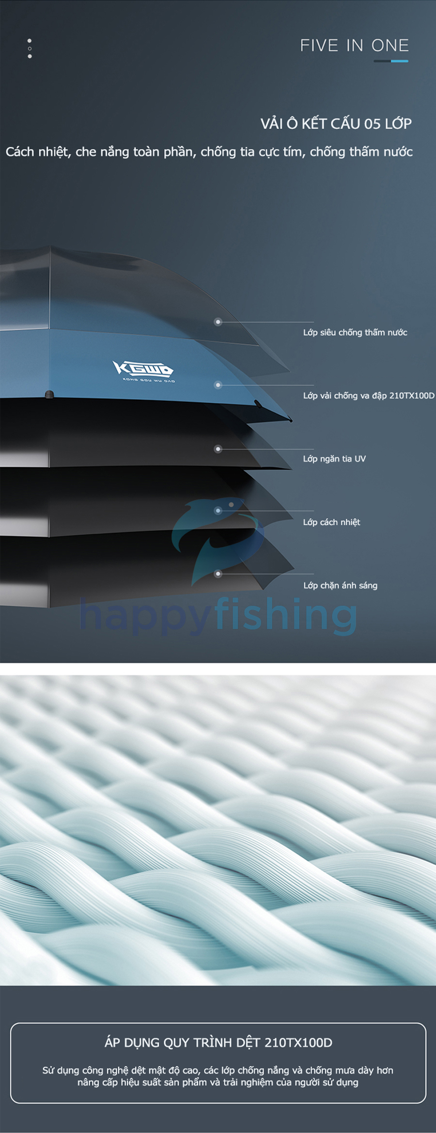 - Cấu trúc 05 lớp vài bao gồm có TEFLON nổi tiếng, tác dụng trong việc làm mát, che nắng, che mưa và bảo vệ da