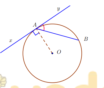 Trong một đường tròn, góc tạo bởi tia tiếp tuyến và dây cung và góc nội tiếp cùng chắn một cung thì bằng nhau.