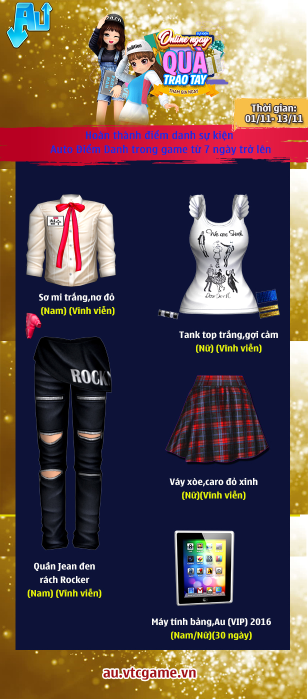 Nội Dung: Trong thời gian sự kiện, tất cả vũ công có đăng nhập game từ 01/01/2018 đến 30/09/2018 nhưng không đăng nhập game trong tháng 10/2018 hoàn thành nhiệm vụ sau:+Hoàn thànhnhiệm vụ nhận quà sự kiện Auto Điểm Danh trong game từ 7 ngày trở lên